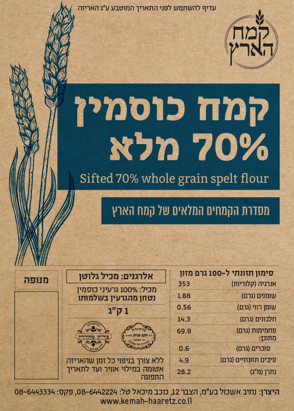 לא מעורבב עם קמח לבן, אלא 30% מהסובין מנופה החוצה. נטחן מהזרע בשלמותו. טרי, נטחן בטחינת רחיים באהבה, ובעבודה עברית. כשר למהדרין בהשגחת הרבנות חדרה ובד"צ מהדרין.